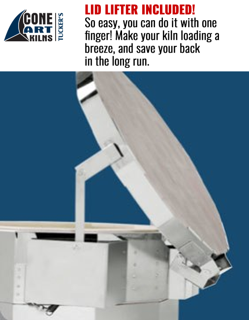 The 4222D kiln comes equipped with Cone Art’s patented lid lifter at no extra charge, making lid lifting a single finger operation compared to a 2-person job with other kilns.