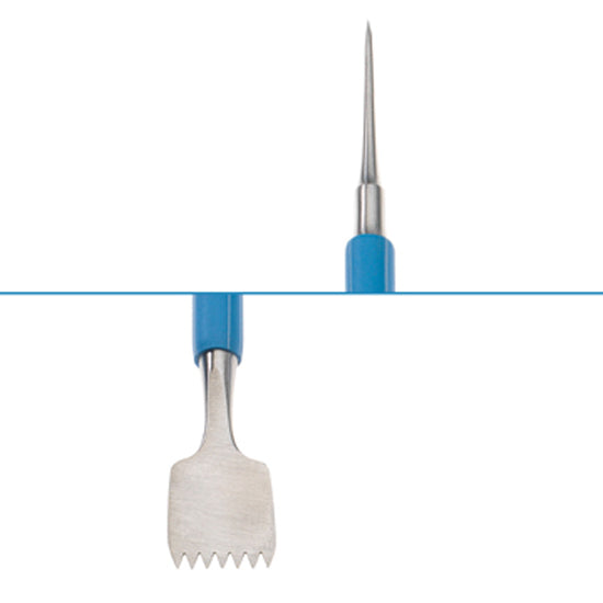 Two tools in one! Each tool is made from high-grade stainless steel and hand-forged to create a solid tool with a sharp needle in one end and a scoring tool on other end. Set in bright color rubber for comfort and secure gripping, they are fun to use, easy to find and won’t roll off the table.